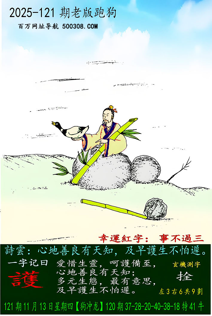 121期跑狗图:一字記之曰:【蟲】 立足水濱,身影疏朗。 長喙疾出,蟲影難藏。玄機測字:《綿》 一語中特:二八佳人